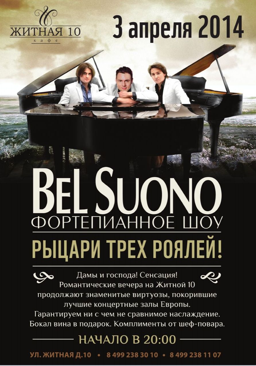 Участники трио не часто балуют своими концертами москвичей. Их выступления чаще проходят в лучших концертных залах Европы. Но совсем скоро услышать их витруозную игру можно будет и в Москве. Bel Suono делает весенний подарок для всех любителей хорошей музыки – концерт «Рыцари трех роялей» состоится 03 апреля 2014 года в столичном арт-кафе «Житная, 10» в рамках романтических вечеров. Для этого выступления Bel Suono готовят специальную программу. У зрителей будет возможность услышать уже ставшими хитами композиции, созданные виртуозными музыкантами: «Libertango», «Мегаполис» и др., а также насладиться лучшими классическими произведениями в оригинальной и неповторимой трактовке пианистов-виртуозов. Мастера кроссовера представят публике как хорошо известные, так и новые композиции.