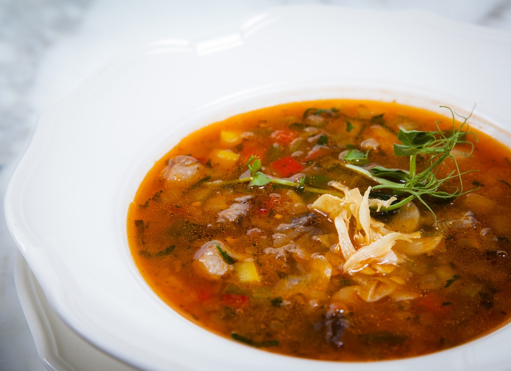 Темой обширного зимнего меню стали основательные мясные блюда. Все новинки – это большие и сытные порции, как и полагается в холодное время года. Даже салат по-андалузски (420 р.) здесь составляет конкуренцию основному блюду, благодаря щедрому количеству вяленой говядины, собственного приготовления. А зная, что среди новинок появился душистый суп из ребра бычка с белой фасолью (400 р.) – холодов можно не бояться вовсе.