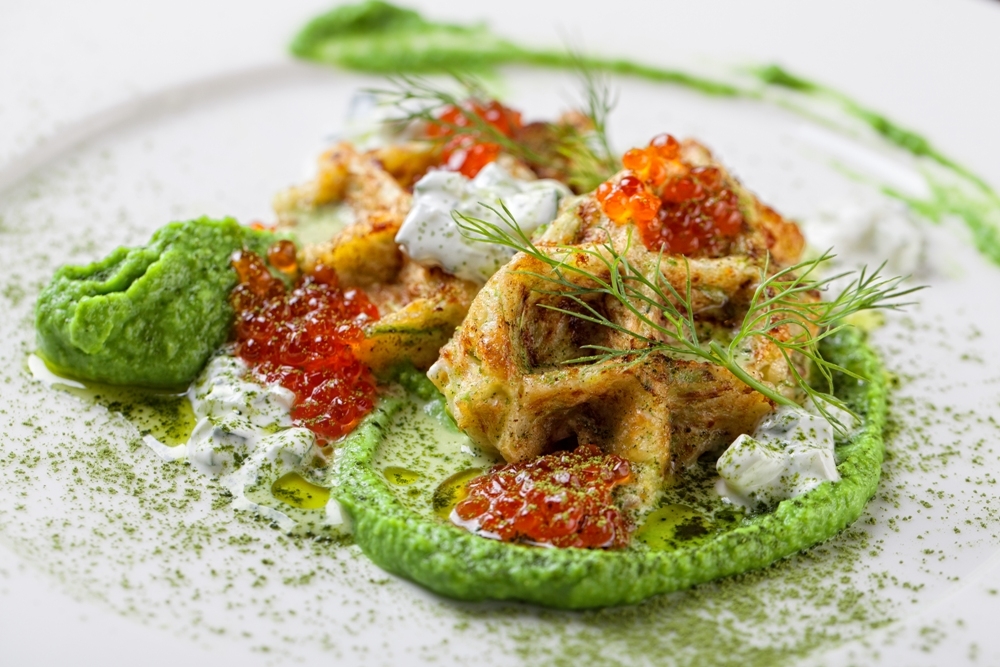 - Вафли из кабачков с салатом из огурца, яблок и красной икры