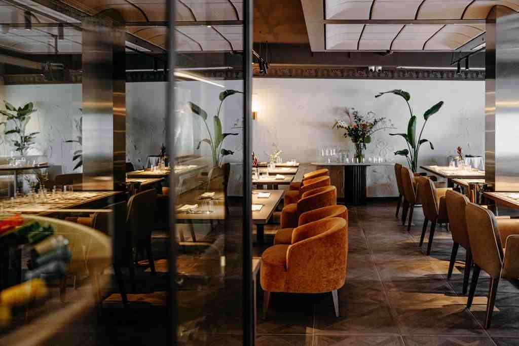 Тёплое дерево, мягкая мебель в оттенках апельсина и фисташки, большие зеркала и зеленые растения — Avero Mio получился по-будничному уютным и по-праздничному элегантным. За окнами – старая Москва, внутри – два этажа, наполненных любовью к итальянскому образу жизни и вниманием к каждой детали, от вышивки на салфетке до рисунка на подсвечнике. Особое место в проекте отвели освещению – свет здесь словно создает собственные сценарии: от оживленного завтрака в кружках утренних солнечных лучей, проникающих через большие панорамные окна, до романтического ужина при свечах в атмосферной полутени. Для частных мероприятий и особых встреч предназначен отдельный камерный зал, оформленный в стиле кабинета-библиотеки.