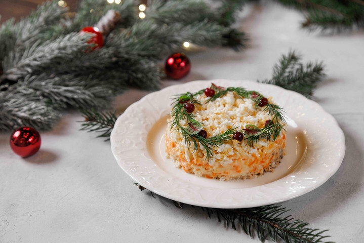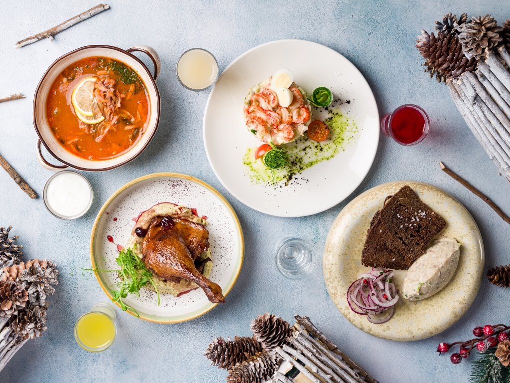 Густая солянка мясная, оливье с раковыми шейками, мюнхенский салат с колбаской, утиная ножка с пюре из сельдерея и порея и медовик на сгущенке – зиме и зимнему меню в ресторанах «Кухня Полли» быть.