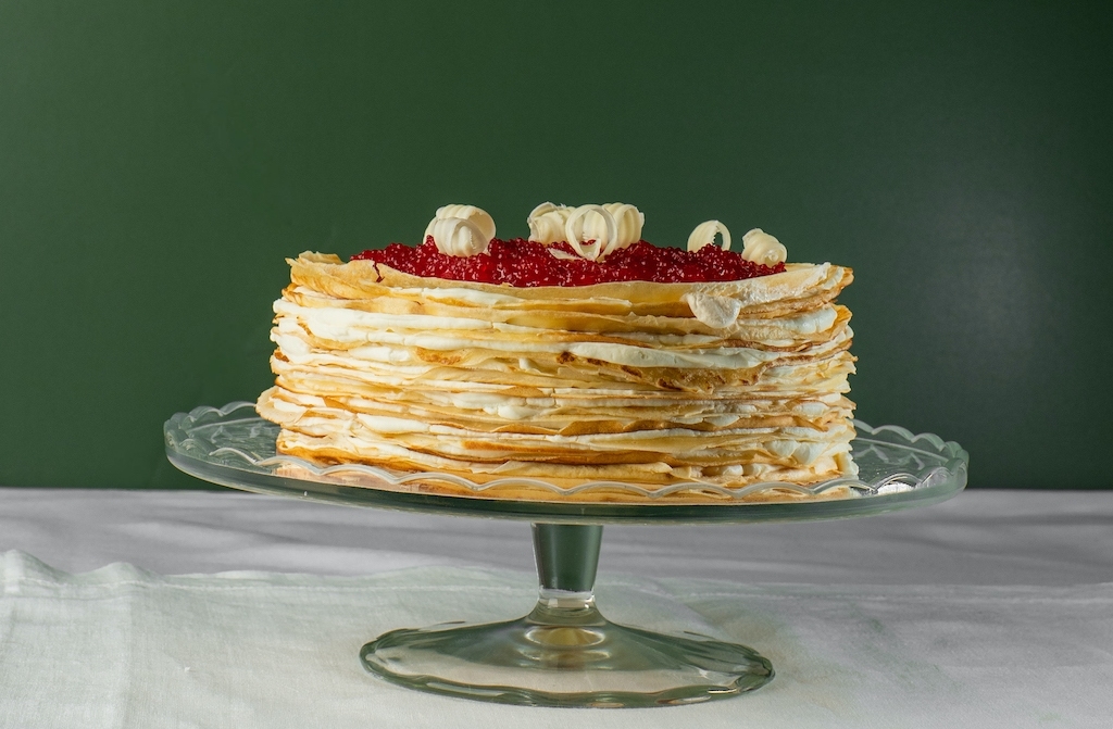 Блинный торт шеф-повар Павел Тарасов делает на основе зож-блинов из кабачков и шпината, а в качестве «крема» выступает риет из красных рыб. Декорируют блинный торт отборной красной икрой и при подаче дополняют сливочным шампань-соусом.