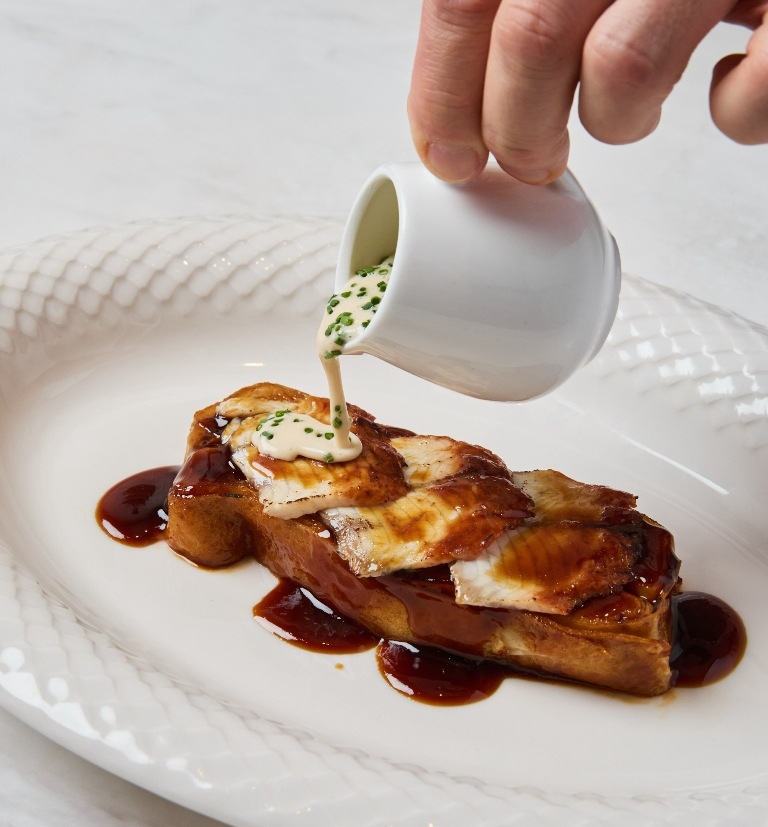 Блинный пирог в Atlantica готовят с начинкой из угря и трески, а за оттенки вкуса отвечает терияки и венчающий пирог опаленный угорь. Еще один вариант – с томленой говядиной и белыми грибами – посвятили поклонникам мясных блюд: эти блины подают с двумя видами соуса, демиглас и бешамель.