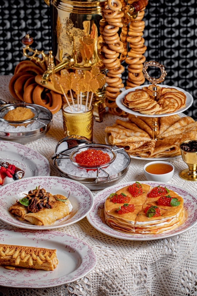 Блинное предложение ресторана — весьма щедрое. Для семейных и дружеских посиделок шеф разработал «Праздничный сет с самоваром». В него входят 15 ажурных блинчиков, 15 пышных оладушек, всевозможные топпинги (икра лососевая и щучья, сметана и варенье, мед и сгущенка), а также бублики, баранки и традиционный для масленичных застолий большой самовар чая.